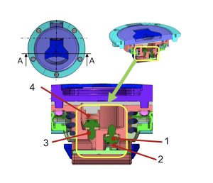 هنگامی که فشار در باک افزایش یابد و سایر سیستمهای کنترلی مانند حبابگیر و کنیستر نتواند آن حجم از افزایش بخارهای سوخت در باک را بگیرد. فشار سمت داخل باک سوپاپ تخلیه (شماره 3) بالا رفته و فنر (شماره 4) را به سمت بالا فشار میدهد. در نتیجه بخارات میتواند از در باک خارج شود. البته همانطور که اشاره شد این حالت فقط برای شرایط اضطراری طراحی شده در حالت طبیعی کنیستر و حبابگیر میتواند حجم بخارات باک را کنترل کند. شکل 14 نمونهای دیگر از در باک را نشان میدهد.
